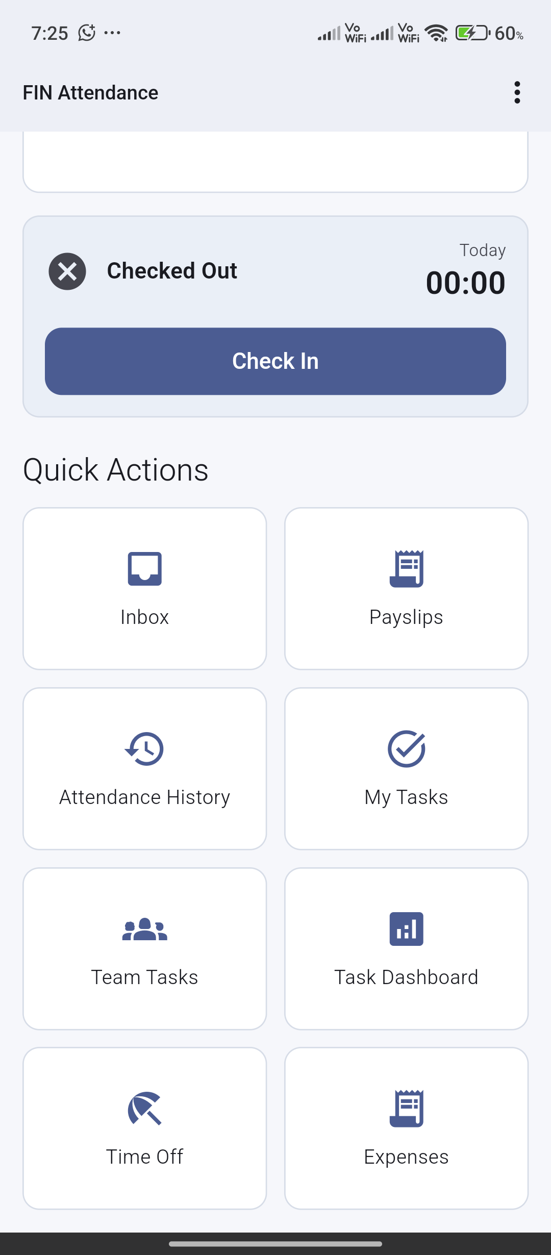 Check-in/out, attendance history, inbox, tasks, leave, expenses, and payslips from a single employee app.