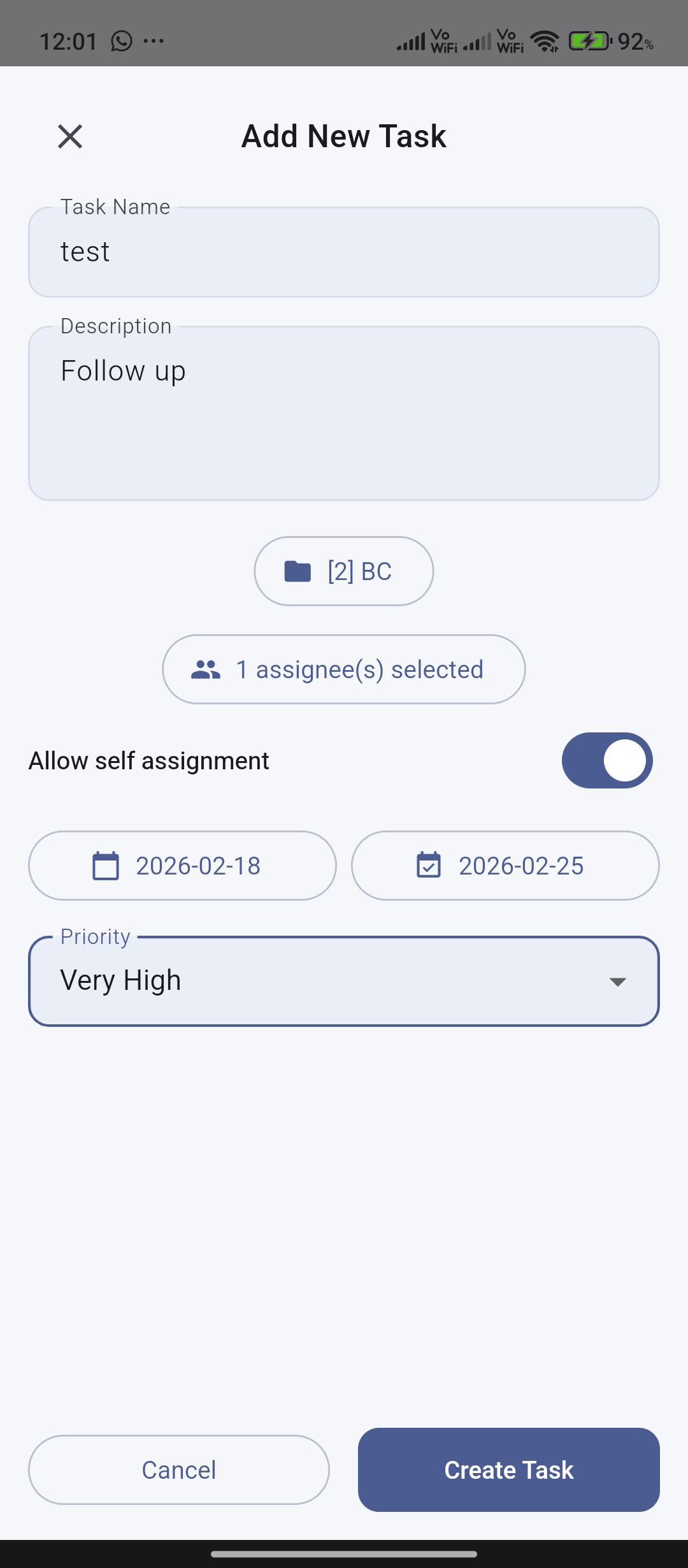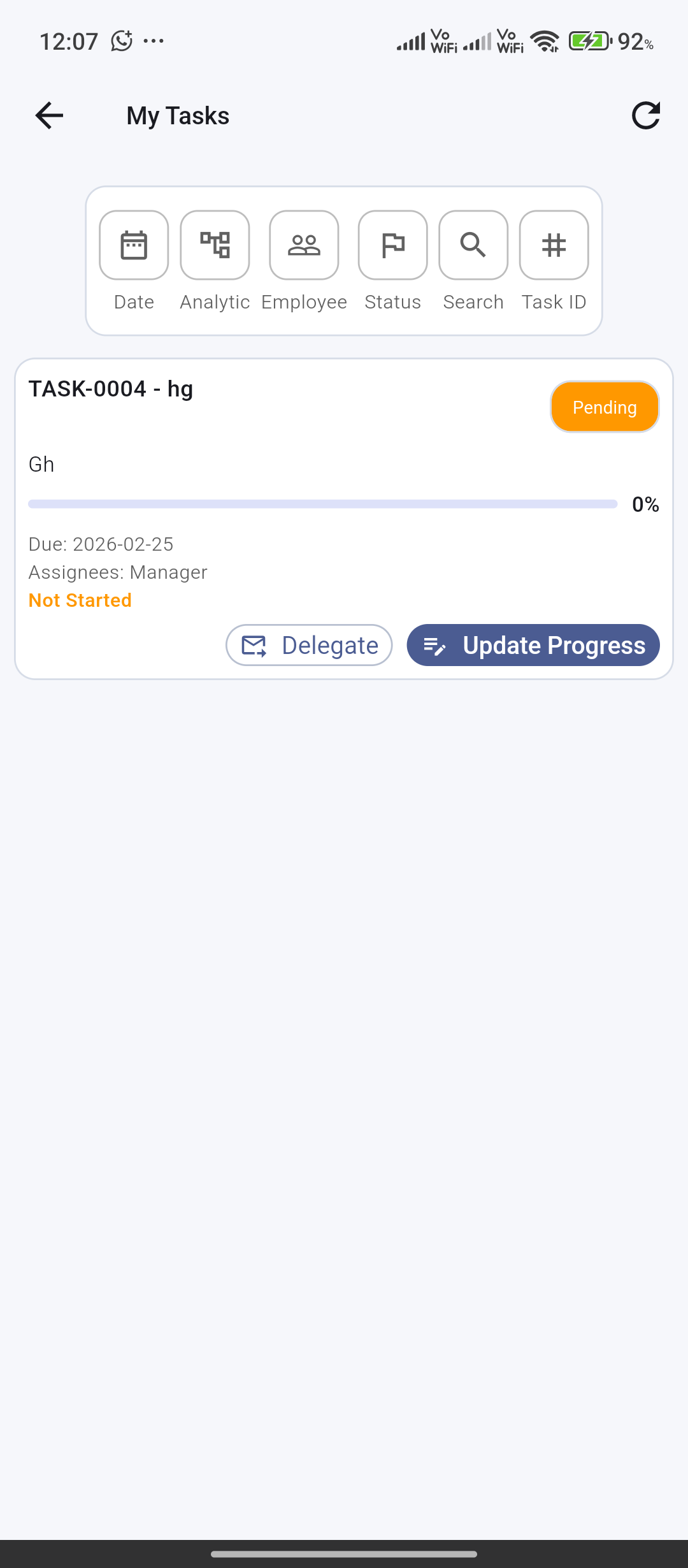 My tasks, team tasks, status/progress updates, delegation, and manager-scoped create/update workflows.
