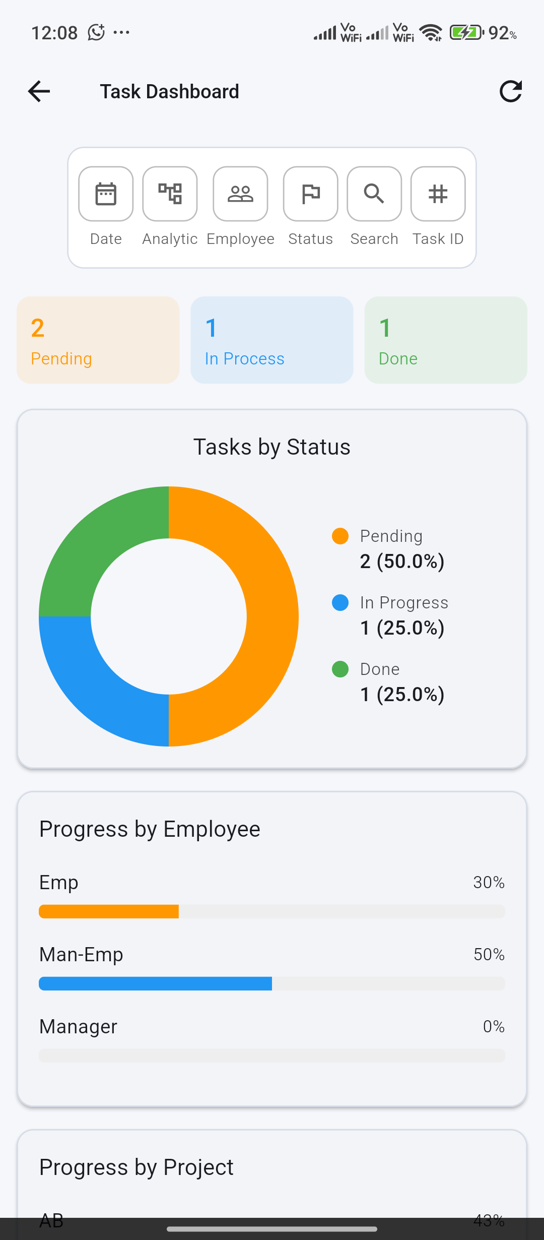 Team summaries include counts by status and average progress by employee and analytic account.