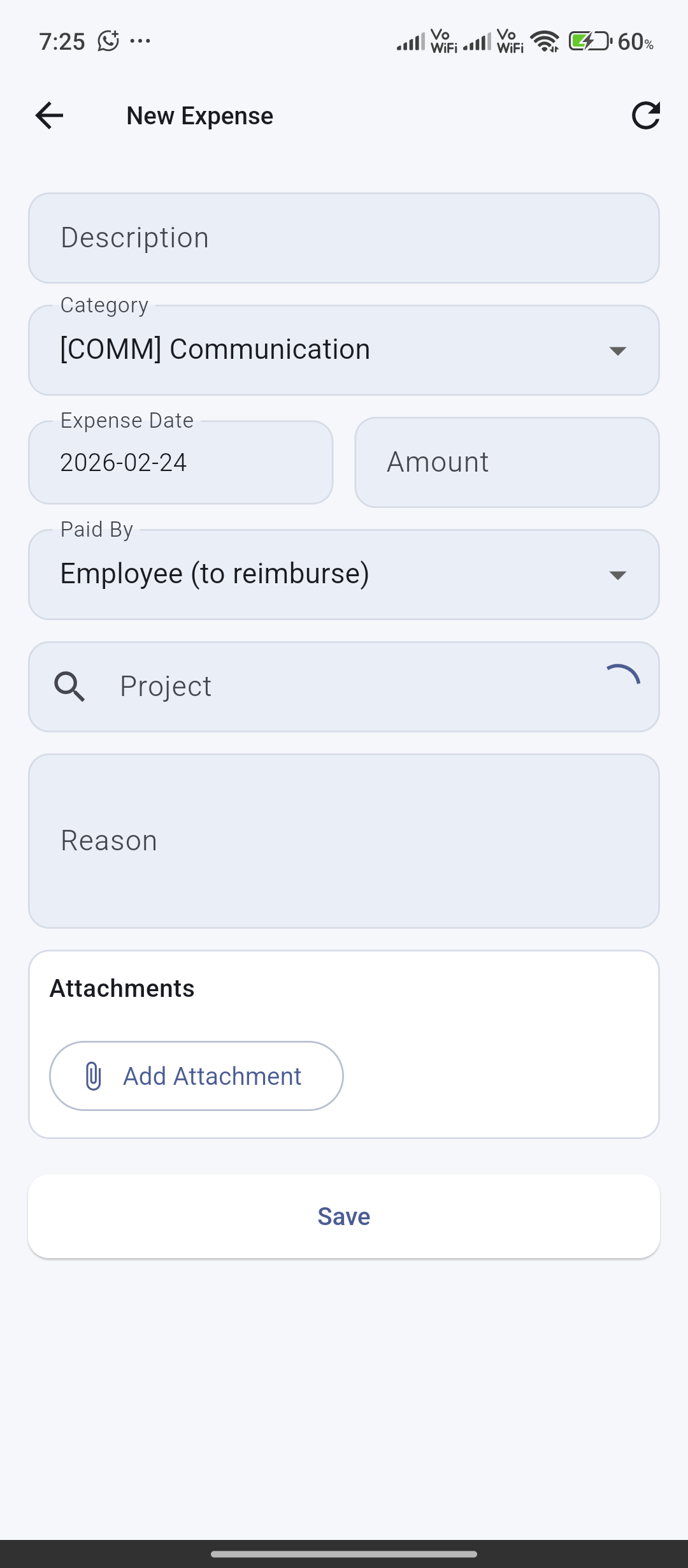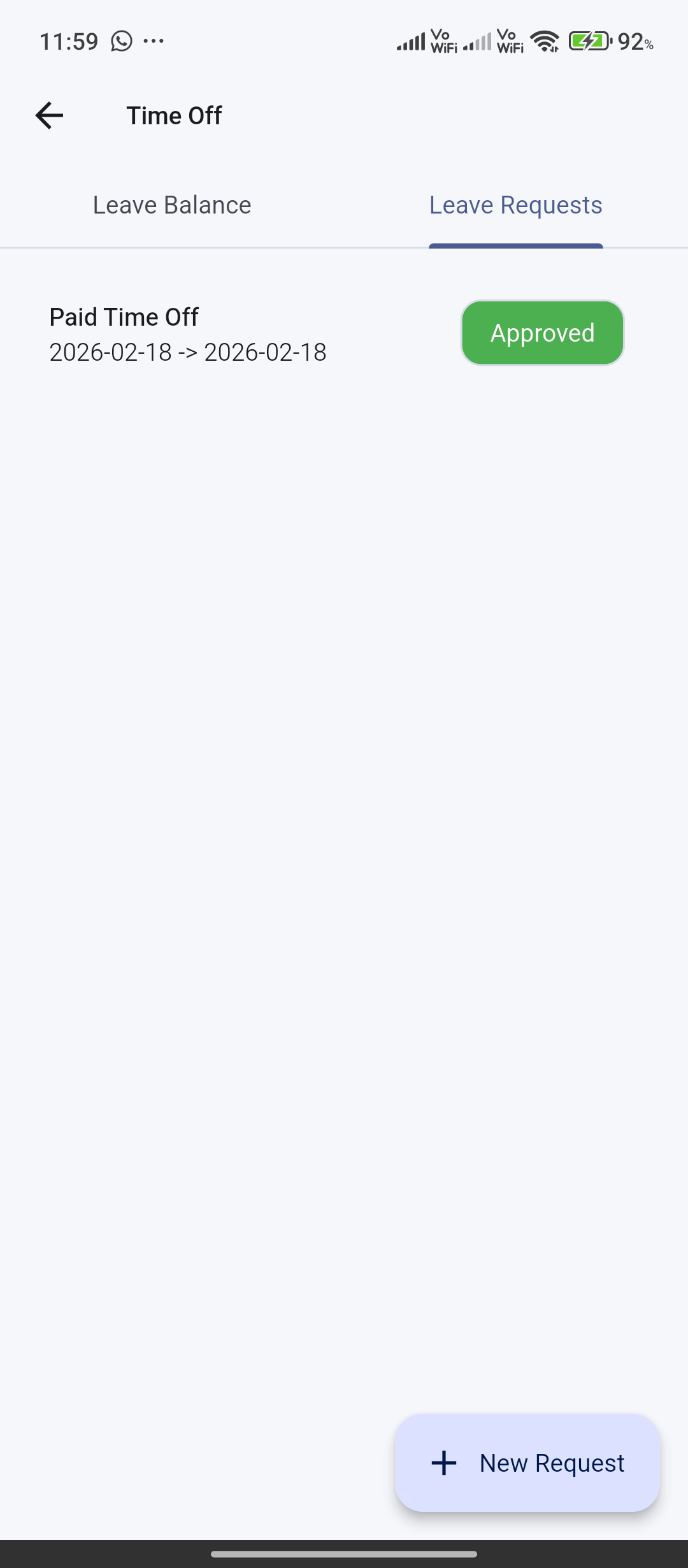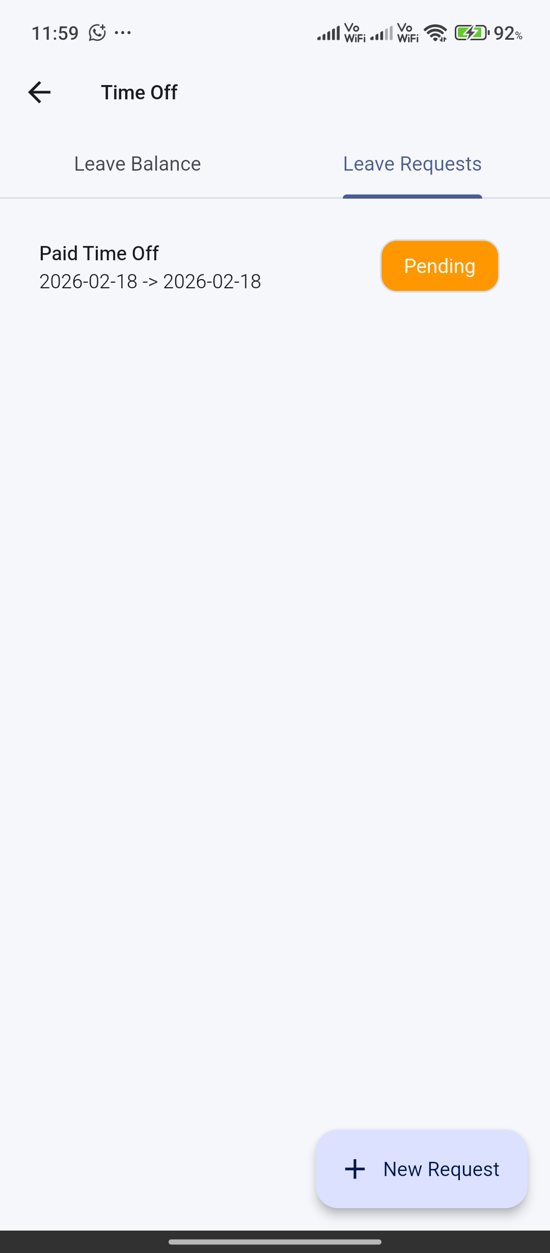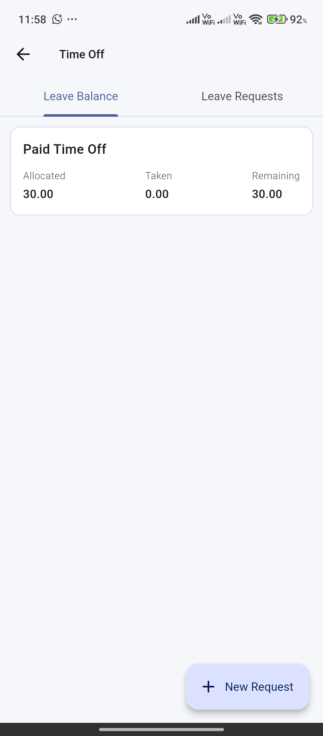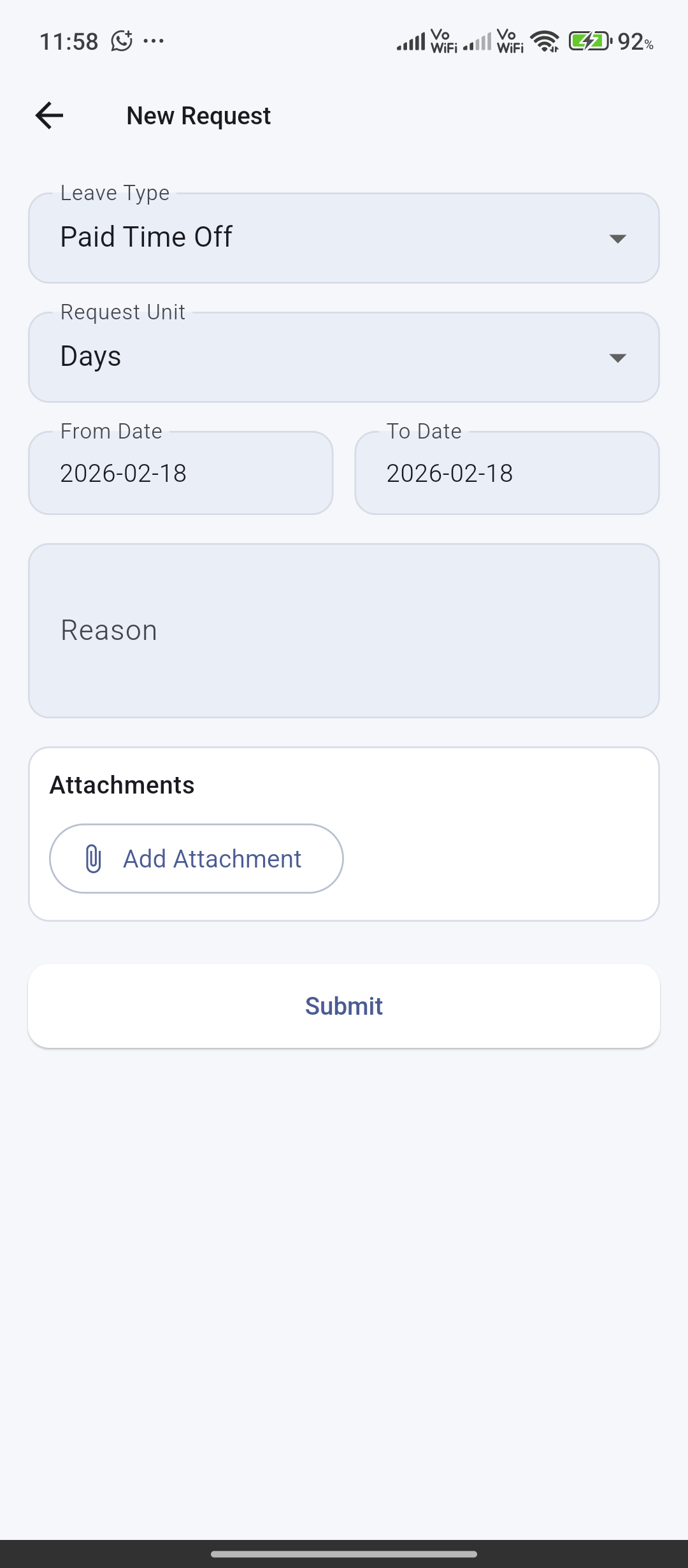 Leave types, balances, and requests for day, half-day, or hour units with optional attachments.
