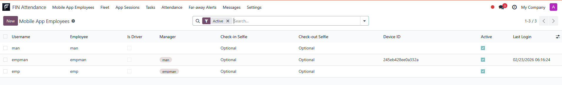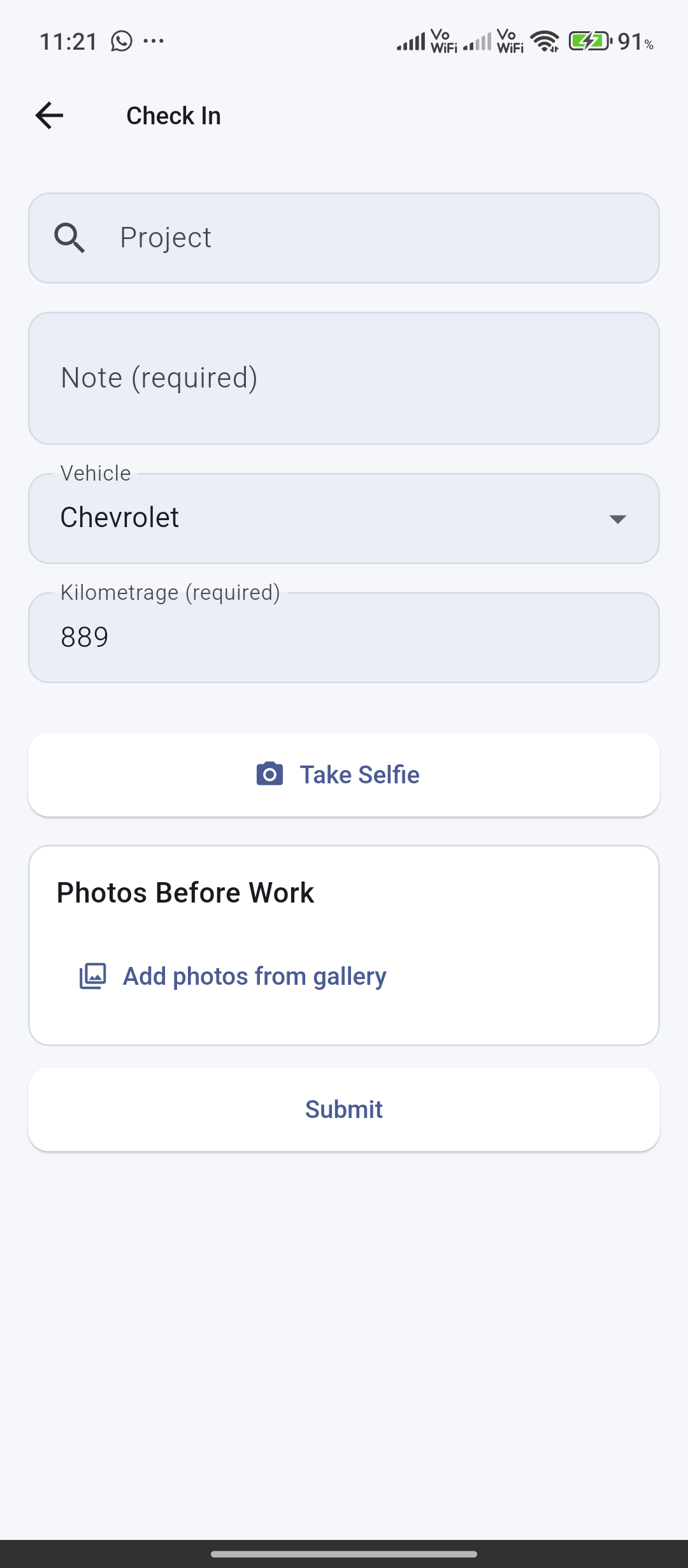 Check-in/check-out selfie can be optional or required at employee and project levels.