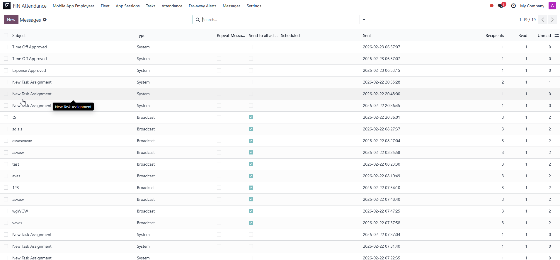 In-app messages with unread tracking and detail screens for operations communication.