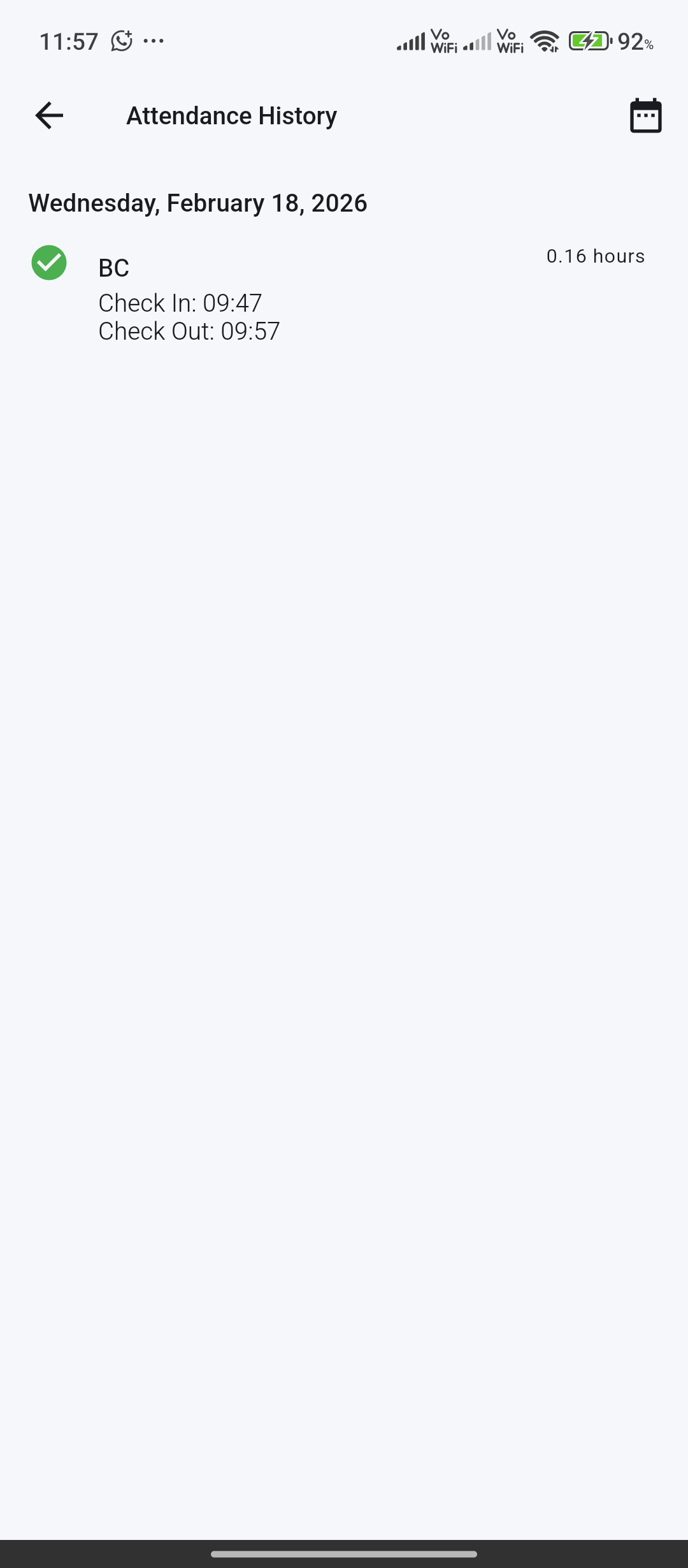 Employees can view attendance history and a timezone-aware worked-time total for today.
