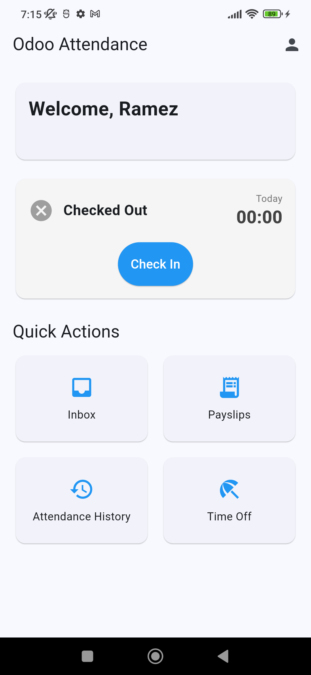 Managers receive inbox messages (and Android push if enabled) on check-in/out.