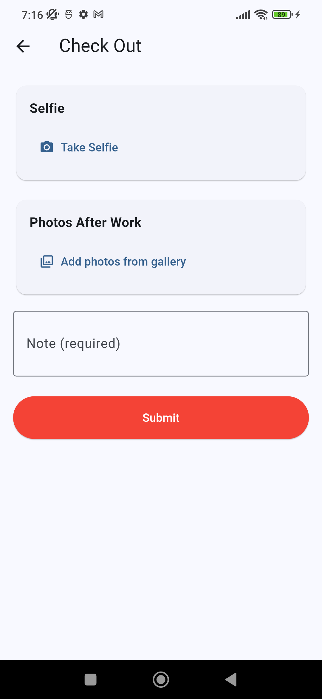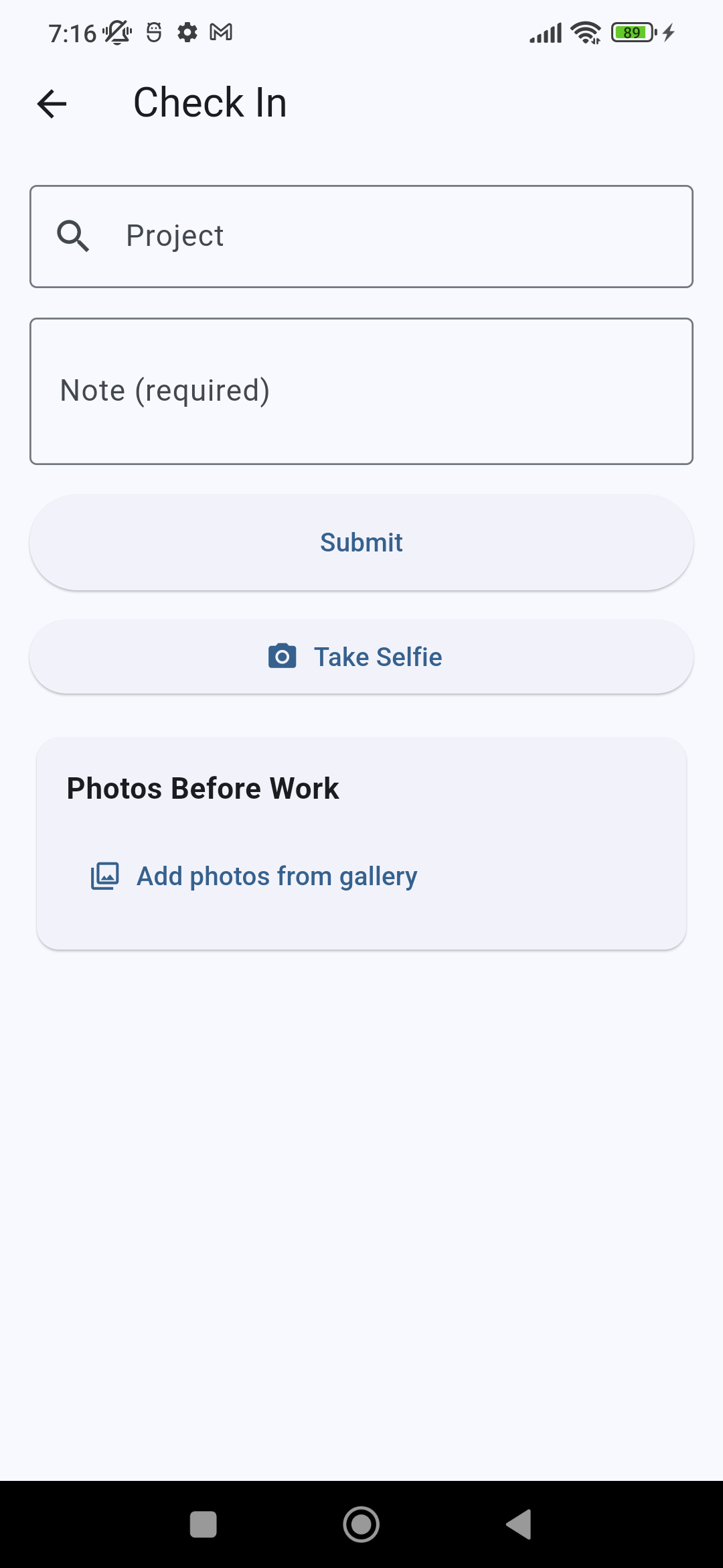 Optional selfie on check-in and/or check-out per employee or per project policy.